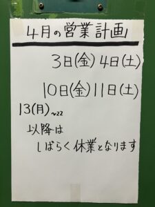 4月13日以降はしばらく休業致します。 6月に特設営業日があるかもしれませんが、未確定です。